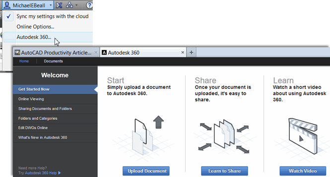 Once you have signed up, you will have some options up on the title bar, including accessibility of Autodesk 360 site where you will find several videos on the available features.